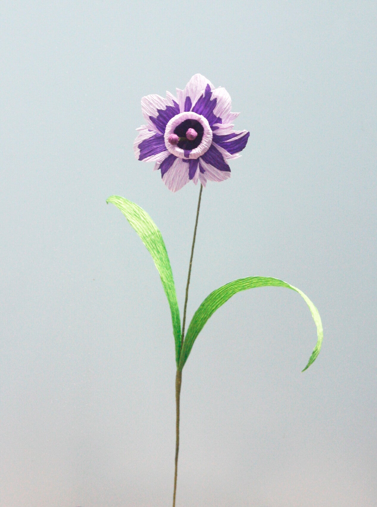 De Trompet is grappig. De bloem ziet eruit alsof hij gaat toeteren uit de kelk. De blaadjes zijn handgekleurd met inkt.