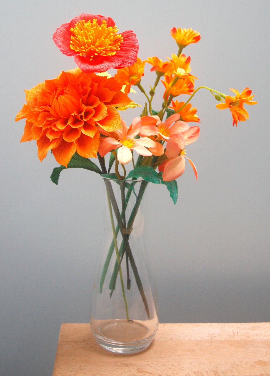 Aan dit boeket zijn twee soorten zijden bloemen aan de crêpepapieren bloemen toegevoegd.
