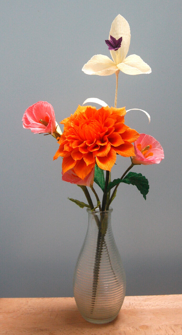 Dit boeket bestaat in zijn geheel uit crêpepapieren bloemen.