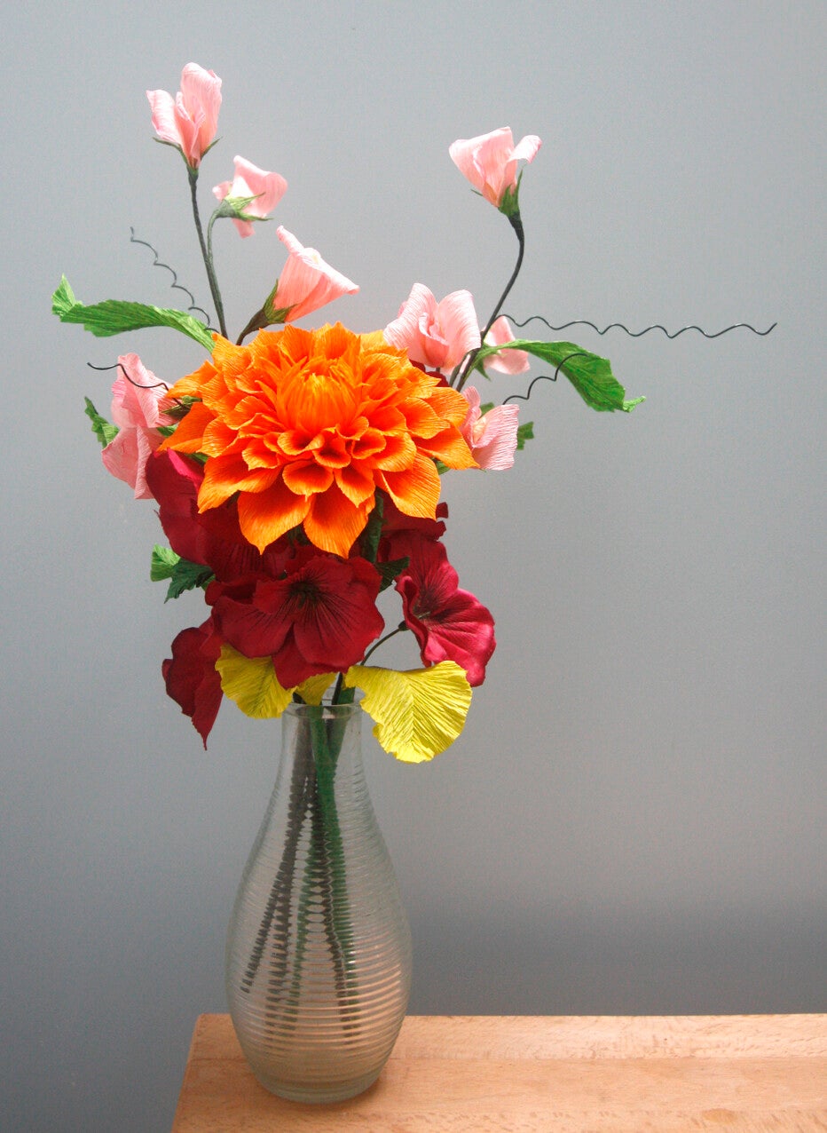 Dit boeket bestaat in zijn geheel uit crêpepapieren bloemen.