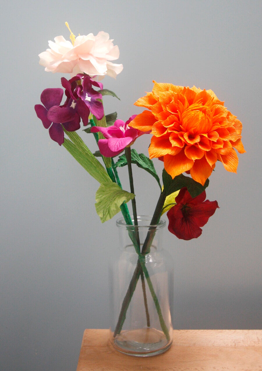 Aan dit boeket zijn zijden bloemen aan de crêpepapieren bloem toegevoegd.